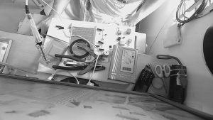 - Soldering iron, stand, desoldering pump, and wire stripper